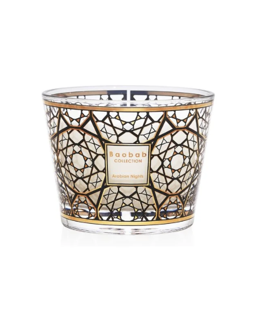 The Arabian Nights scented candle takes us to the mysterious world of the Middle East. With glass screen-printed with 24-carat gold, it draws its inspiration from the famous moucharabieh, open work motifs found in Arab architecture.  Its fragrance of oud, saffron and incense is an invitation into an imaginary journey on the land of a thousand and one nights.